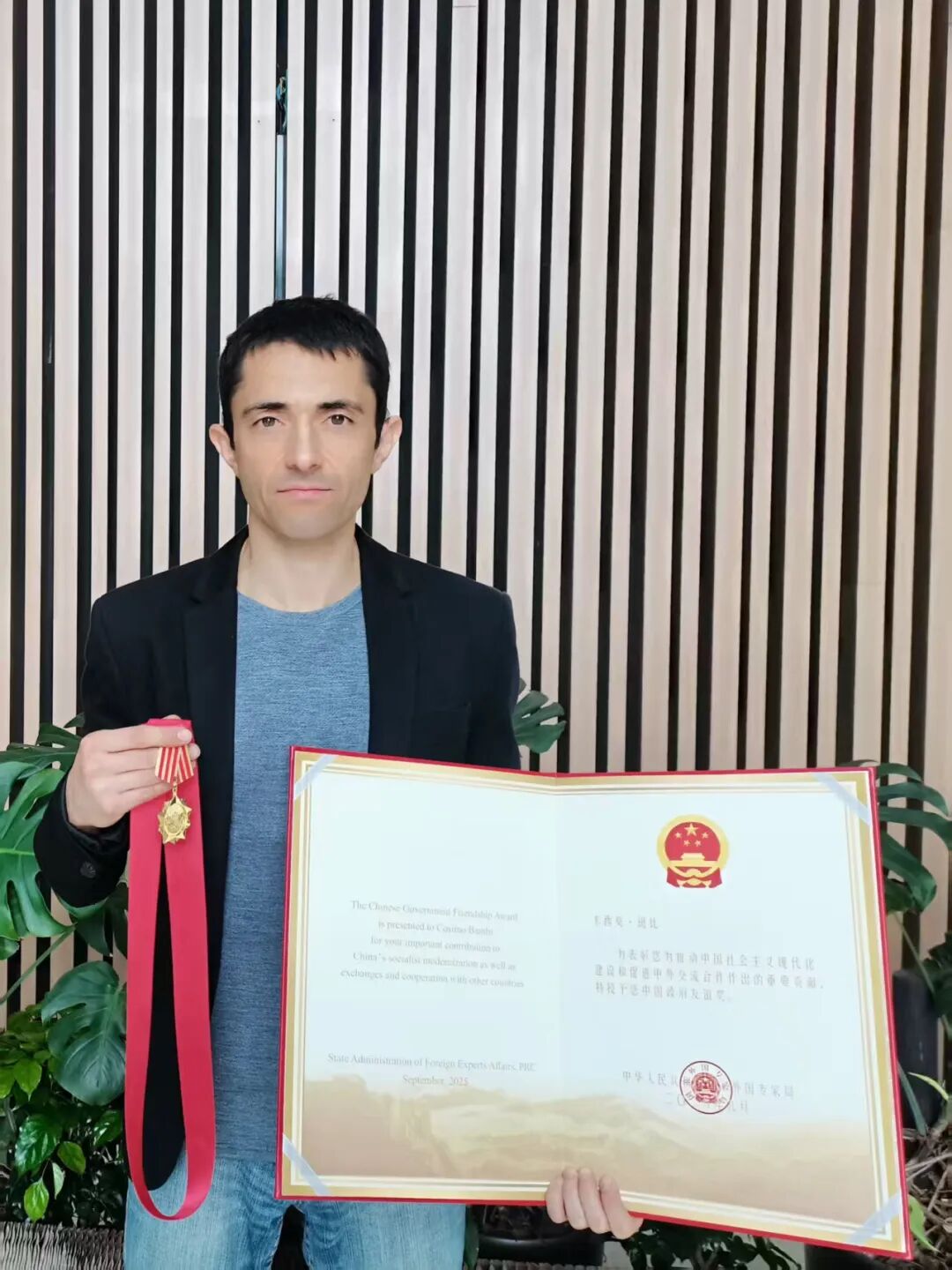 9月30日,中国政府友谊奖颁奖仪式在北京人民大会堂隆重举行。来自意大利的80后天体物理学家、复旦大学谢希德青年特聘教授卡西莫·斑比(Cosimo Bambi)被授予中国政府友谊奖。中国政府友谊奖是为表彰在中国现代化建设中作出突出贡献的外国专家而设立的最高荣誉奖项,2025年度共有50名外国专家荣获这一奖项。从外籍“青椒”到知名专家来华十三年,斑比不仅推动国内高能天体物理的发展,也在这里收获了成长与归属感。